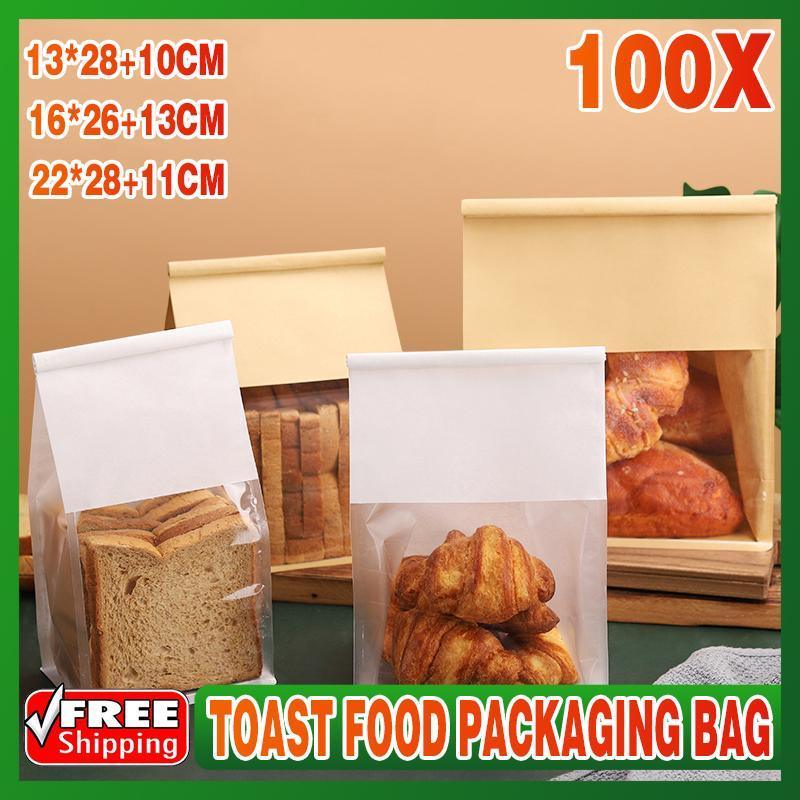 100x Kraft Paper Flat Bottom Cake Packaging Toast Bread Bags With Window Cowhide