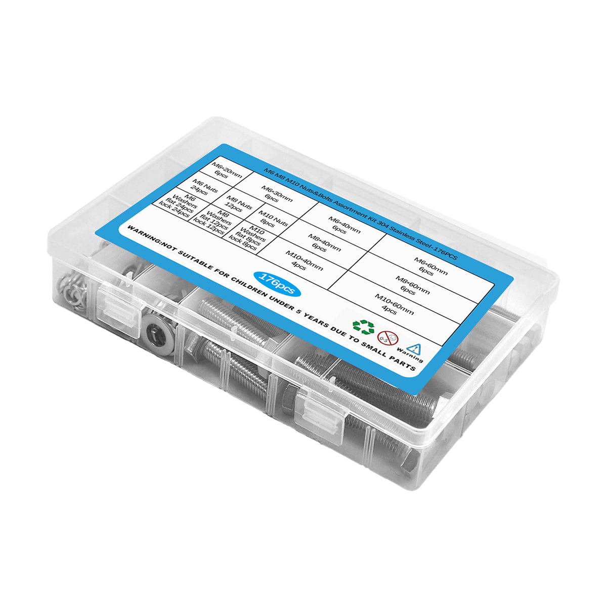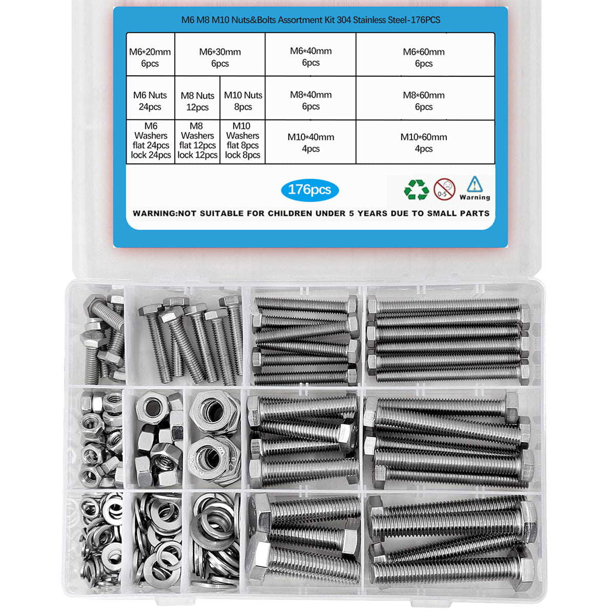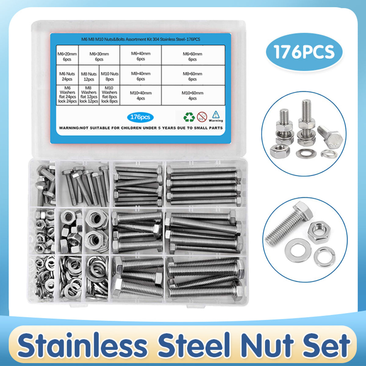 176PCS Stainless Steel Nut Set Silver Hardware Fasteners for Car Home DIY Repair