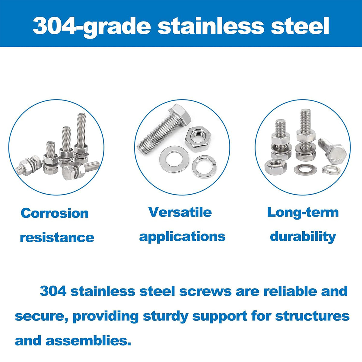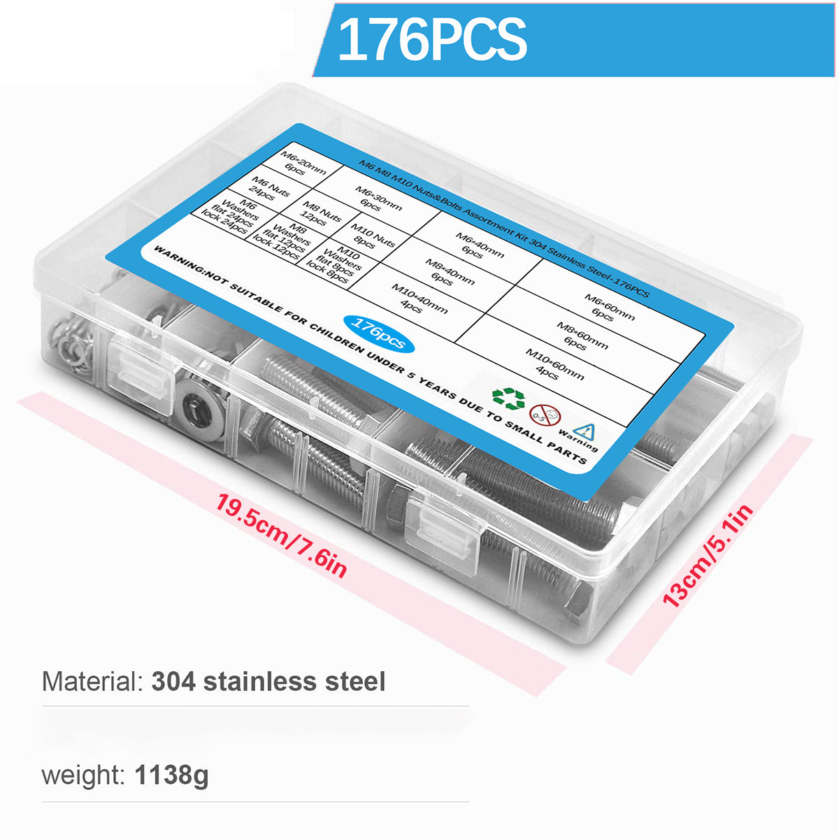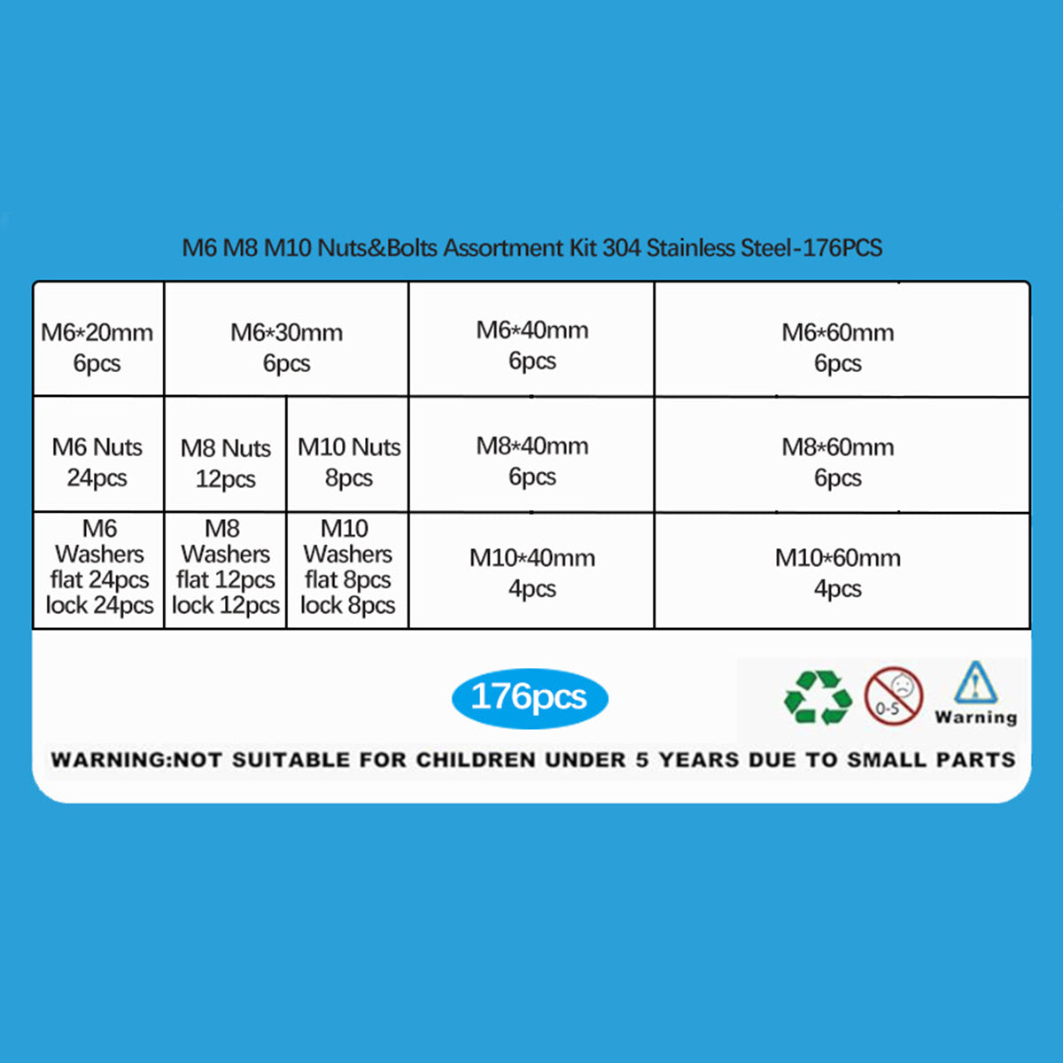 176PCS Stainless Steel Nut Set Silver Hardware Fasteners for Car Home DIY Repair