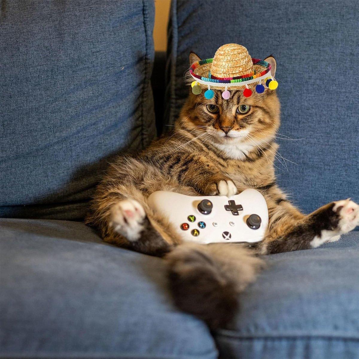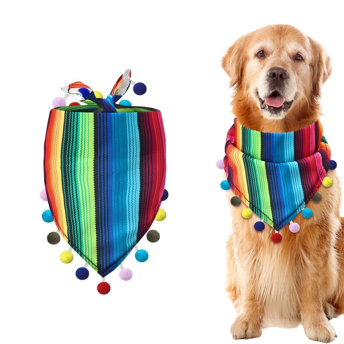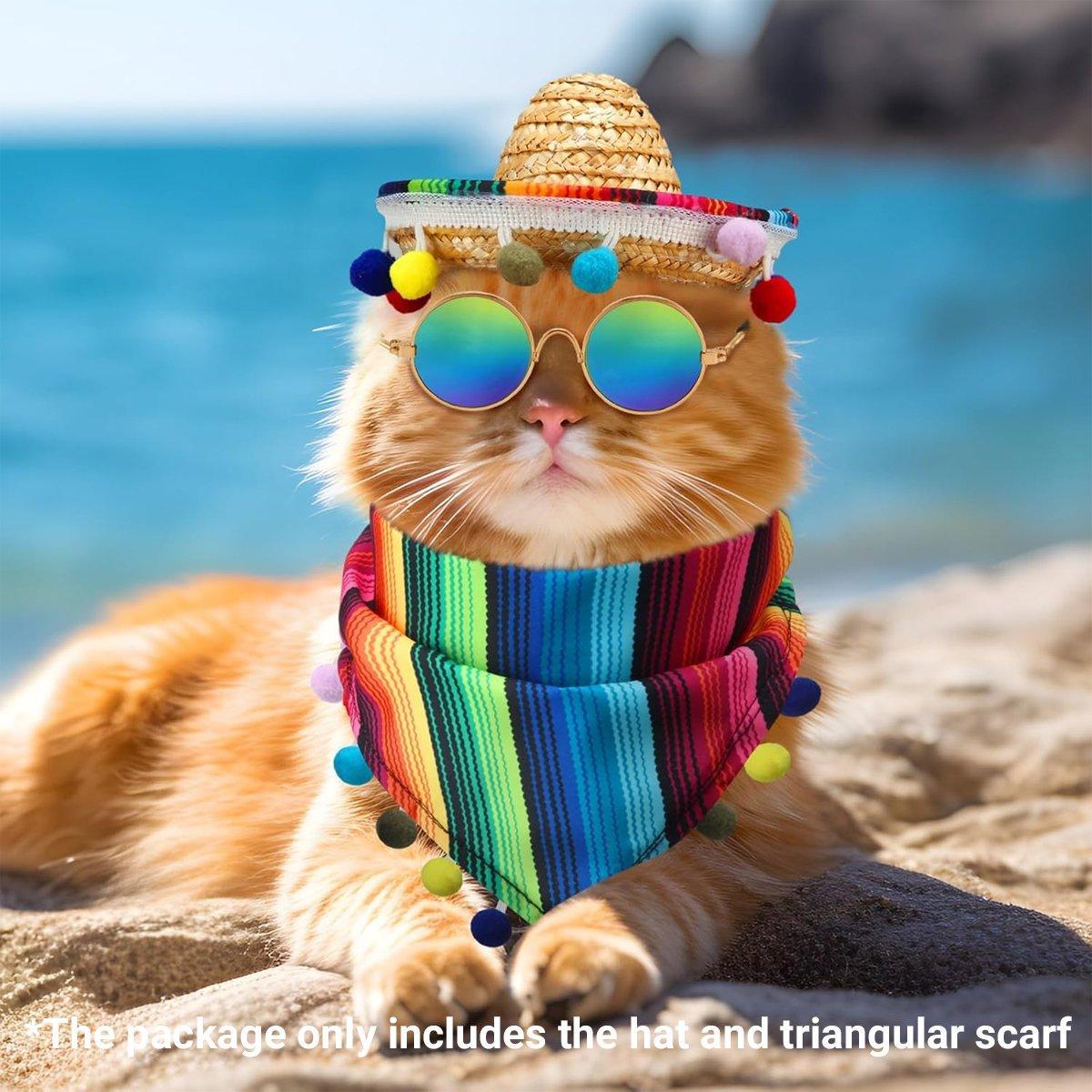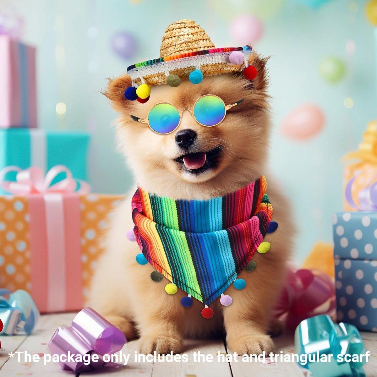 2pcs Striped Triangle Scarf Colourful Hairball Pet Straw Hat Scarf Set for Pets