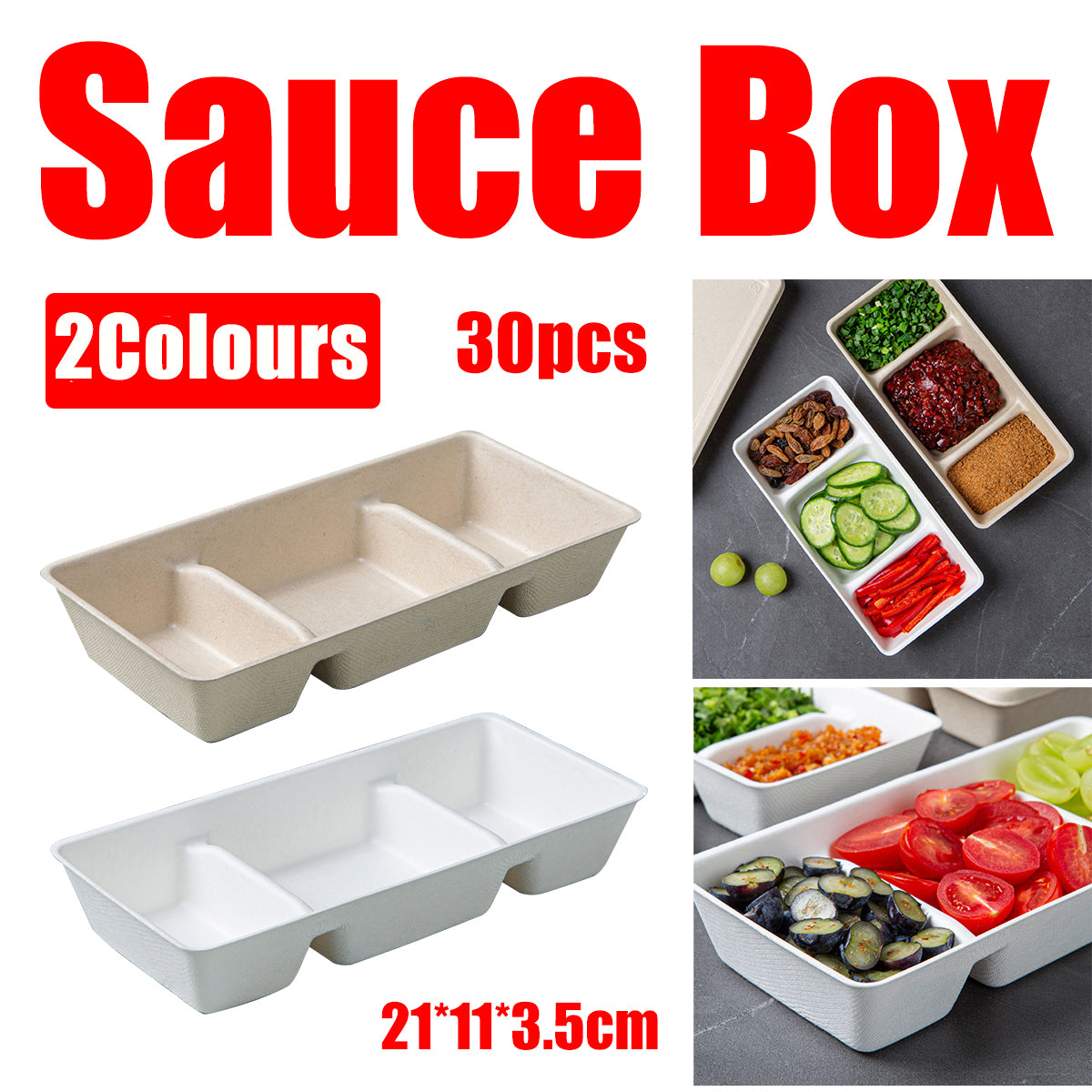 30PCS Disposable Pulp Three-Compartment Dip Box for Sushi BBQ Sauce Condiment