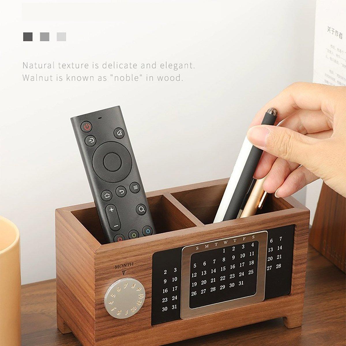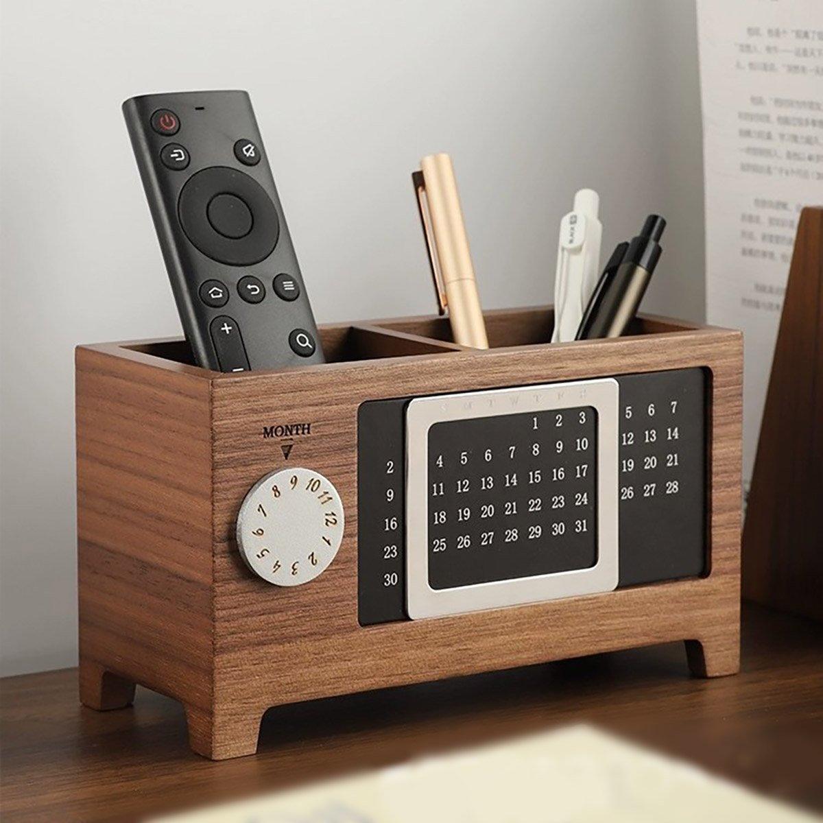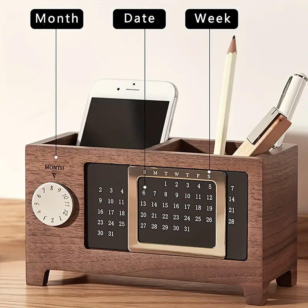 Black Walnut Wood Perpetual Calendar Pen Holder Desktop Organizer Office Storage