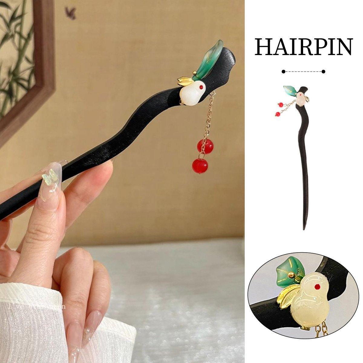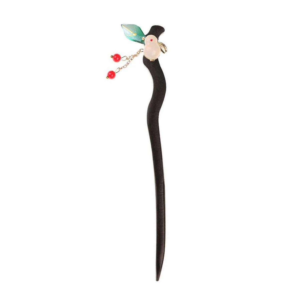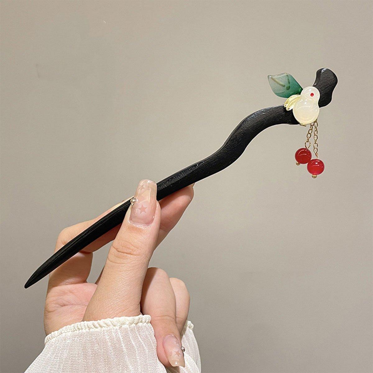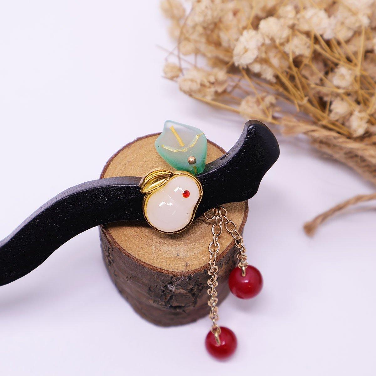 Chinese Style Wooden Hairpin Green Leaves Red Beads Hanfu Headdress