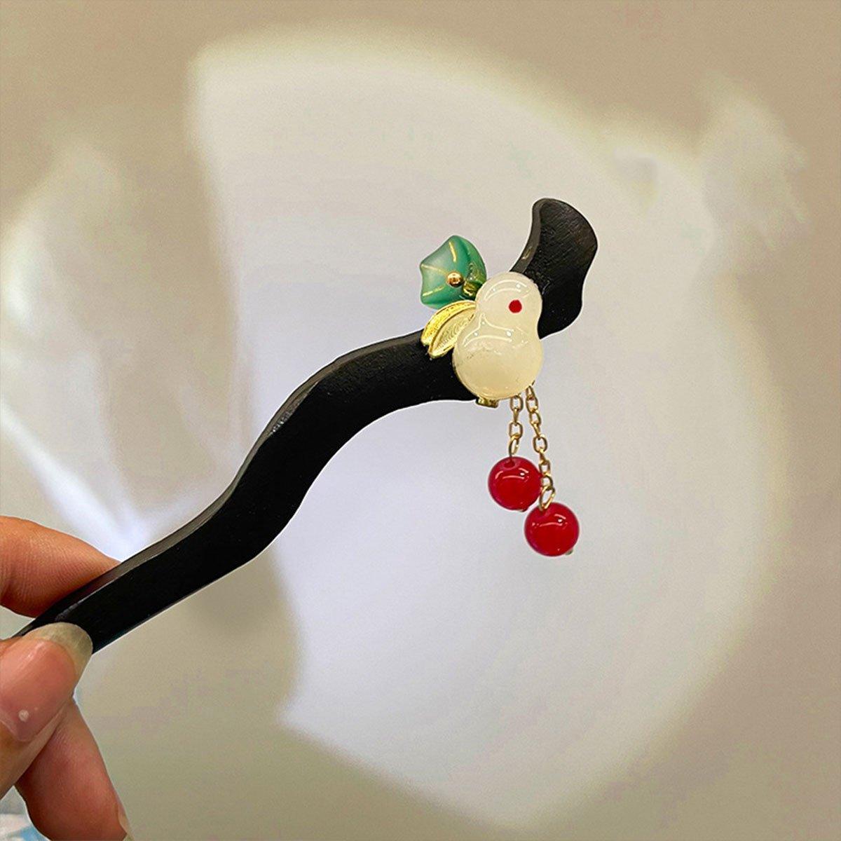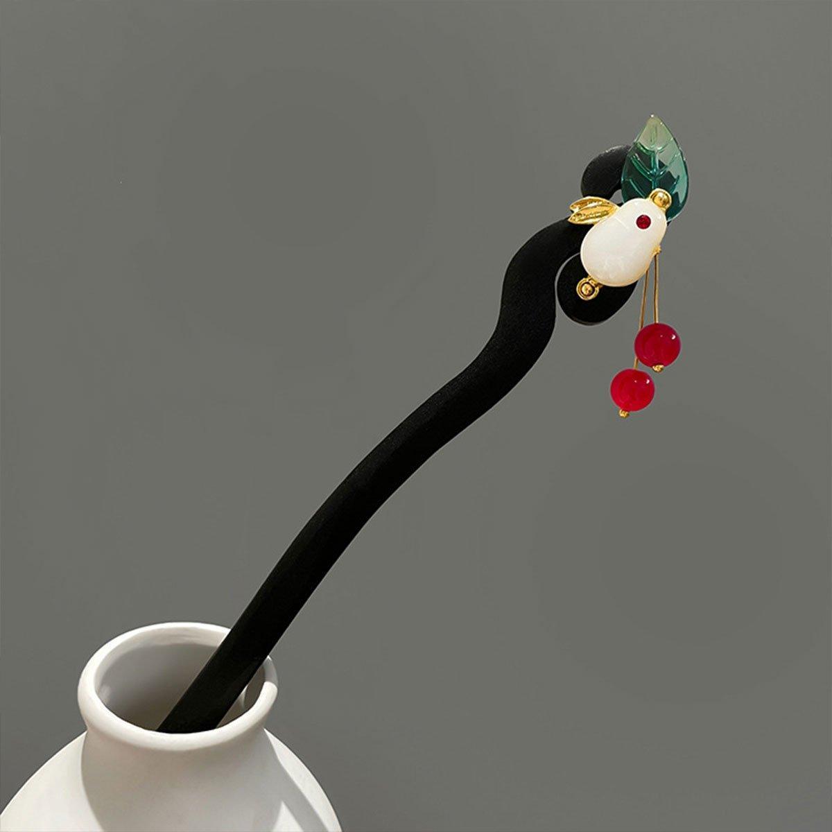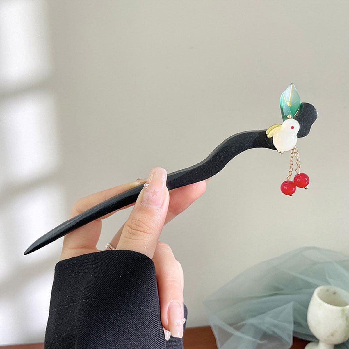 Chinese Style Wooden Hairpin Green Leaves Red Beads Hanfu Headdress