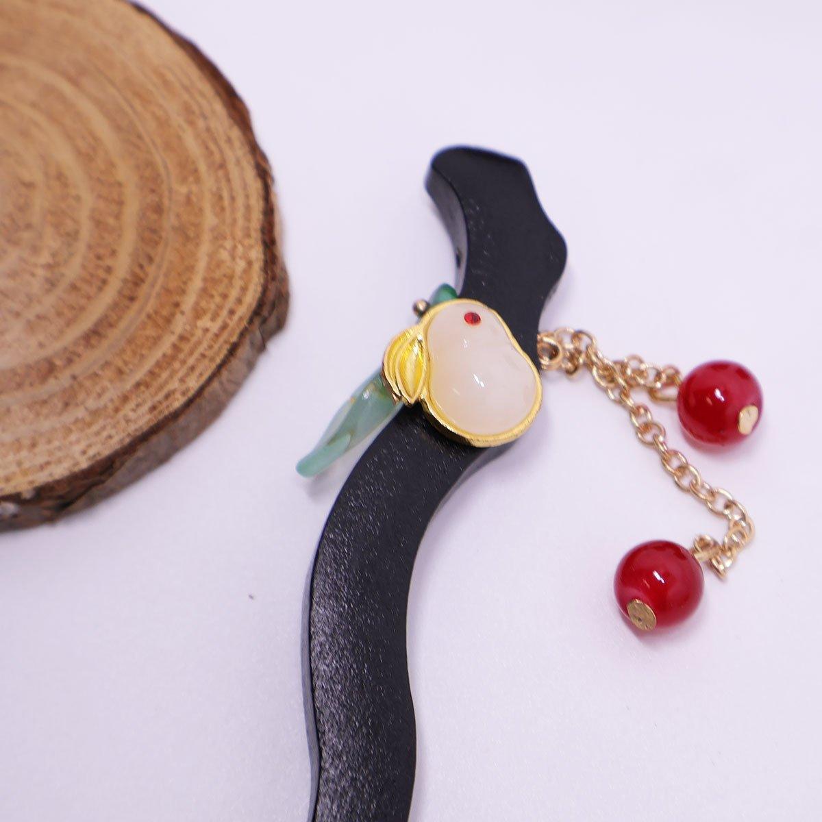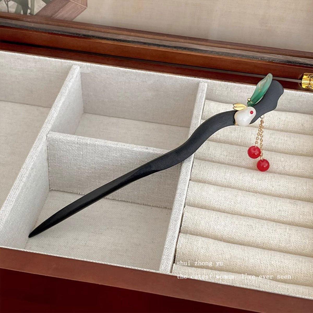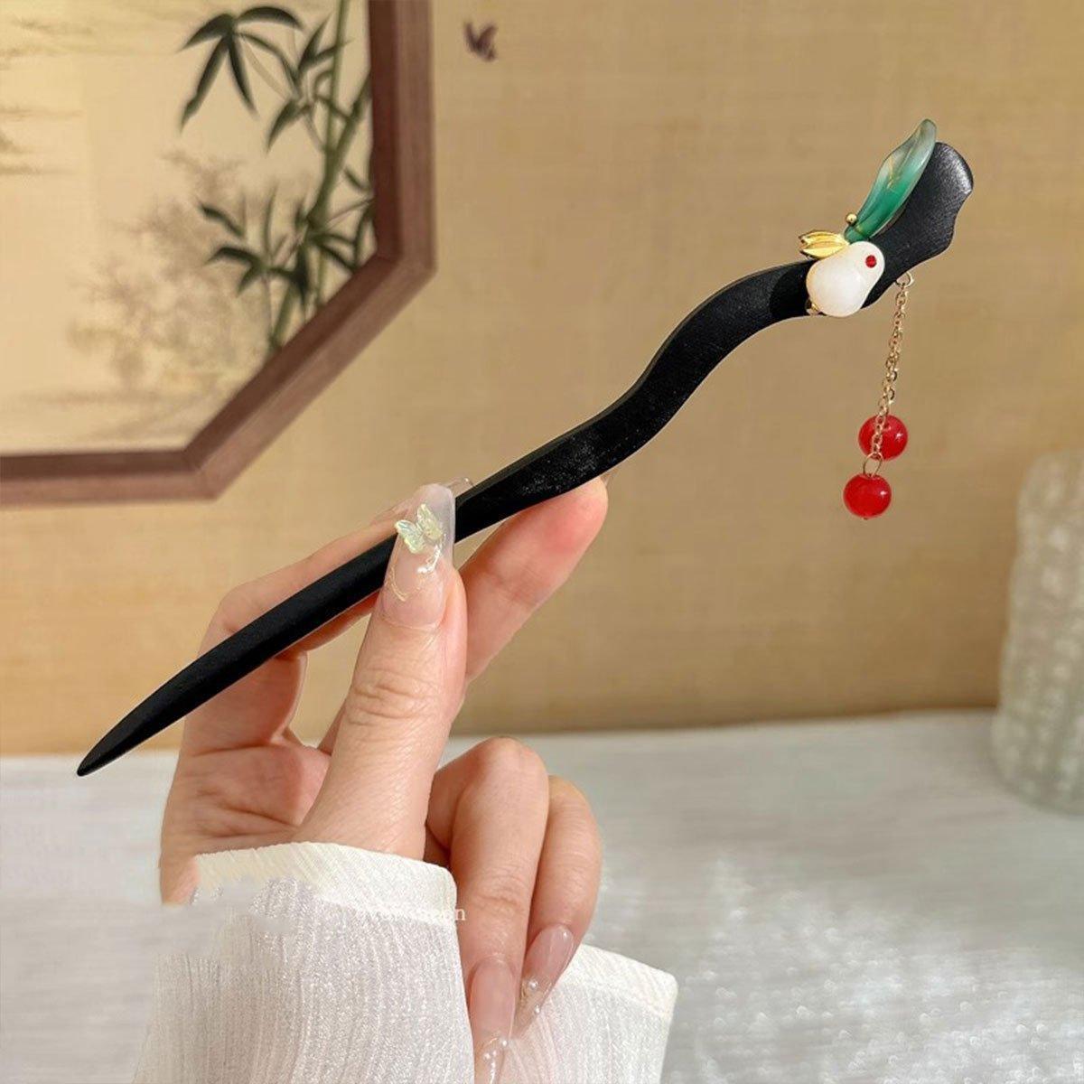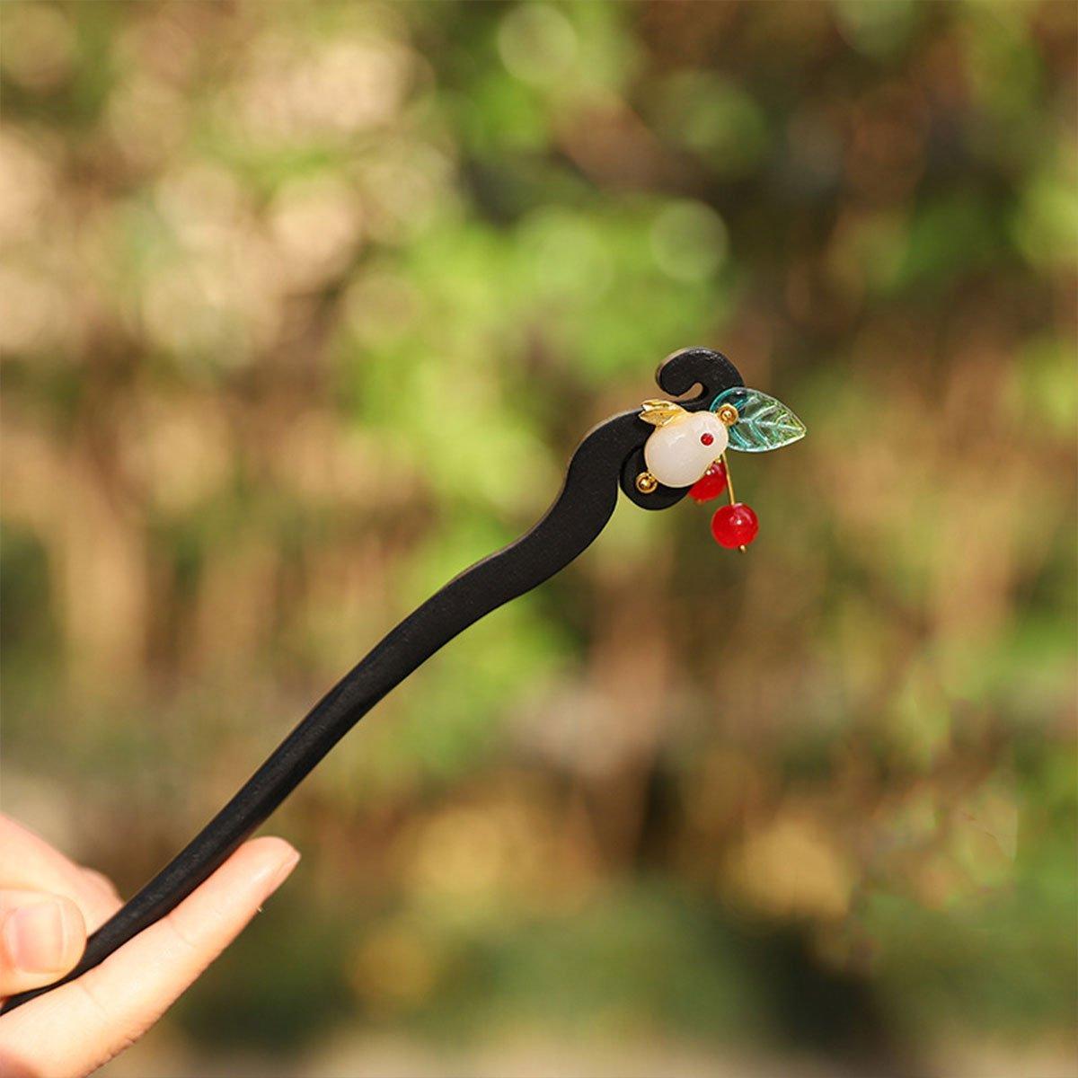 Chinese Style Wooden Hairpin Green Leaves Red Beads Hanfu Headdress