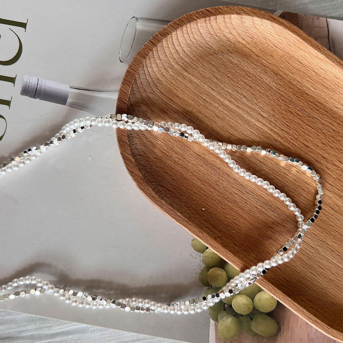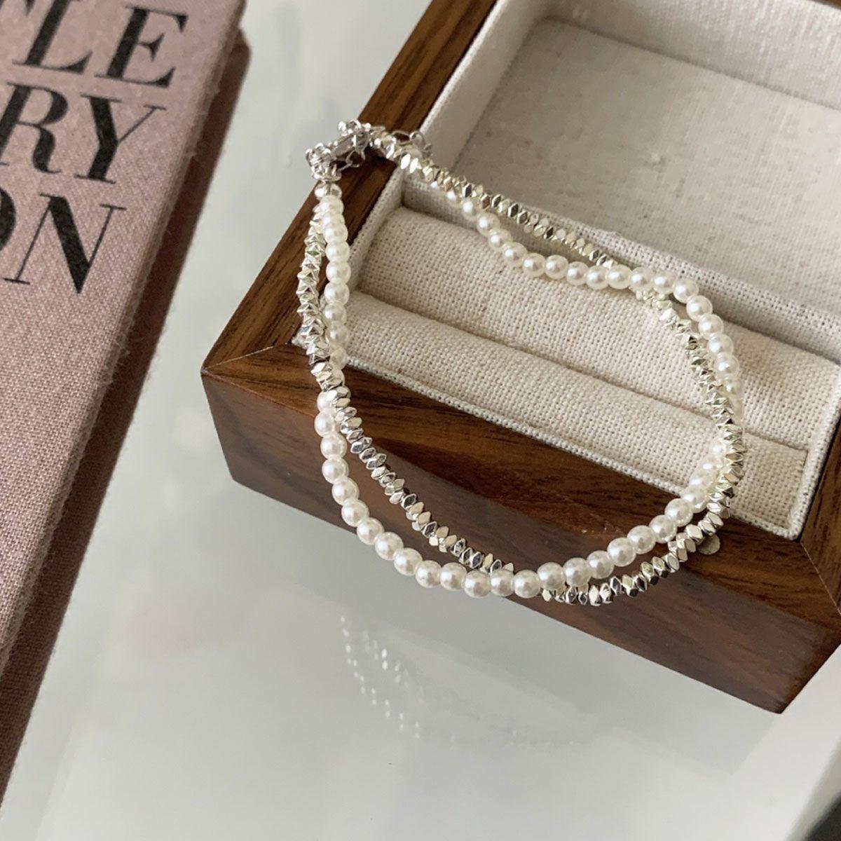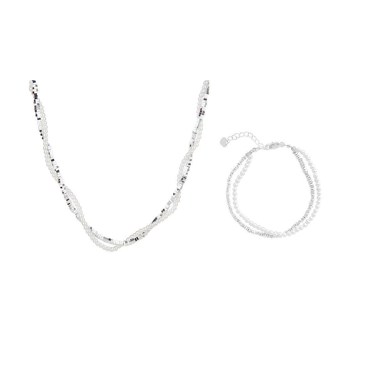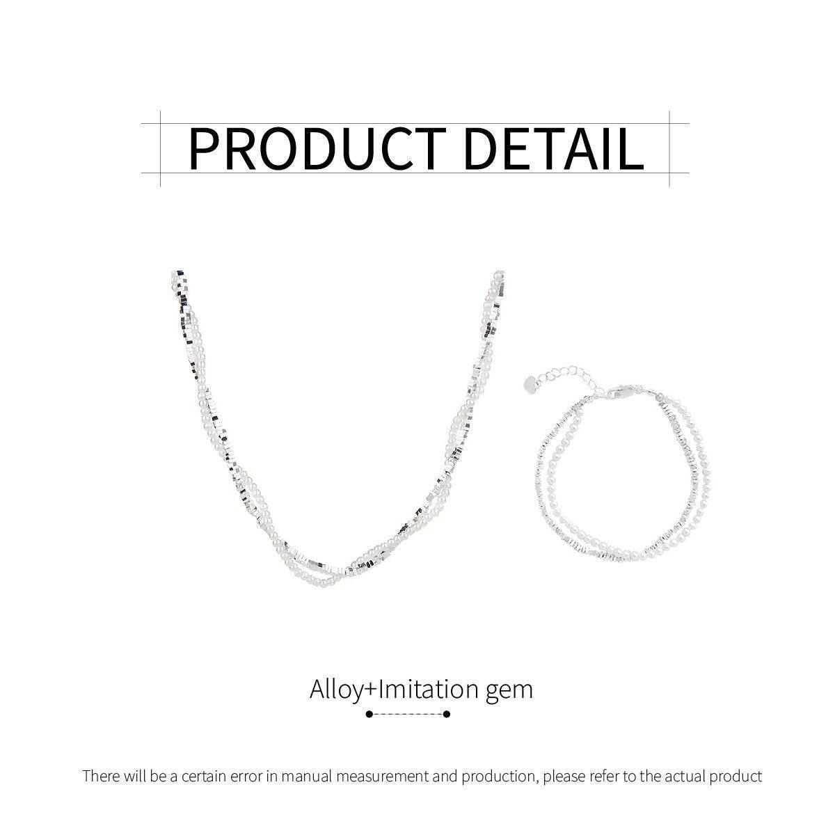 Double Layered Pearl Necklace Bracelet Set Silver Jewelry Women Fashion
