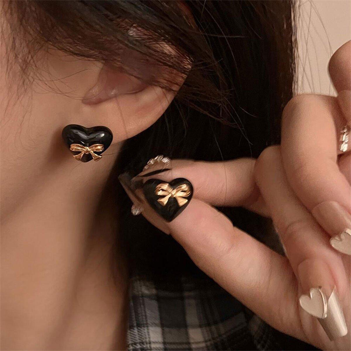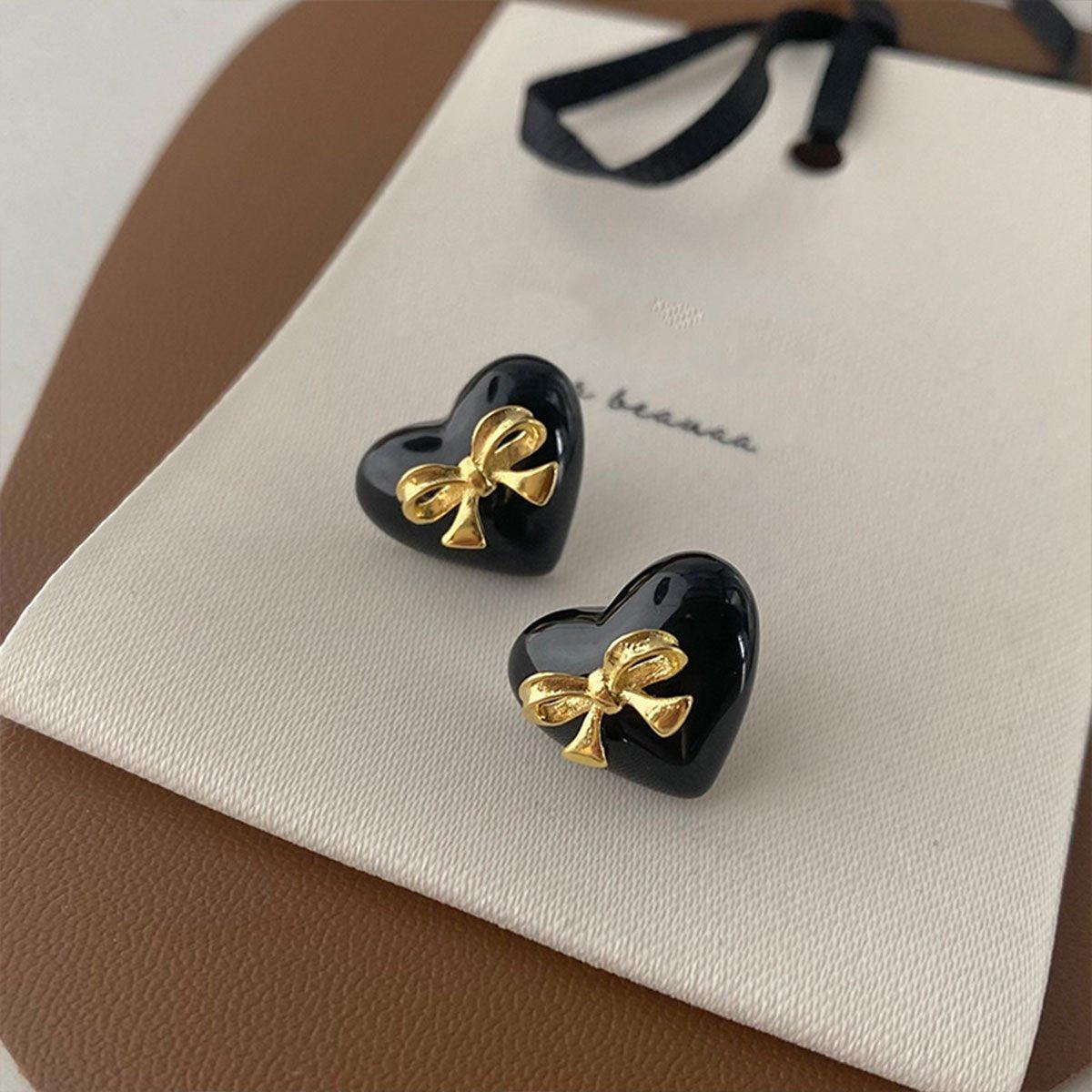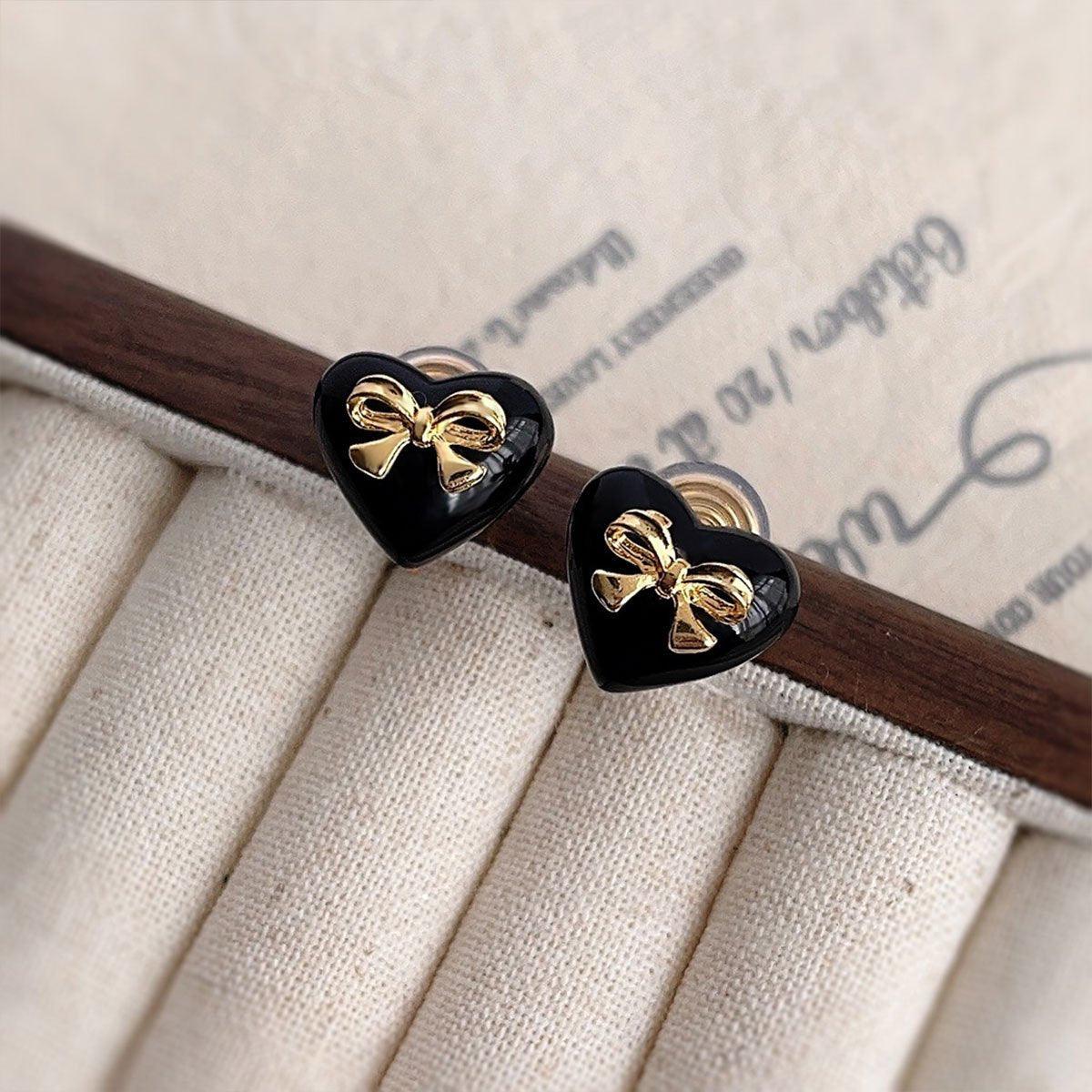 Elegant Black Heart Earrings with Golden Bow for Girls Sweet Fashion Jewelry