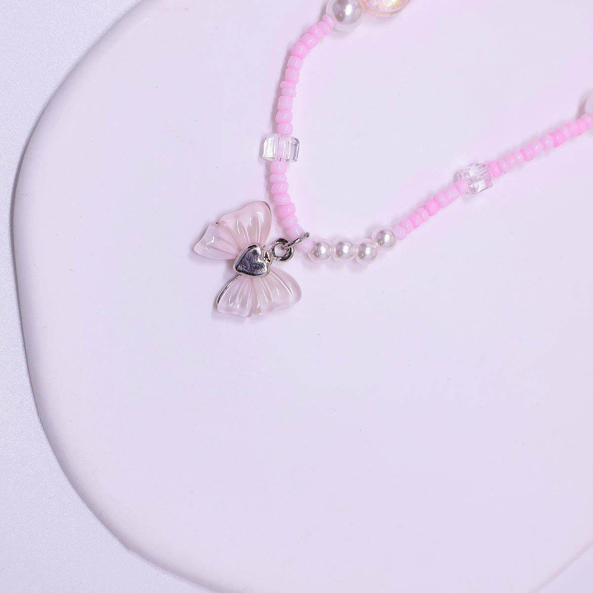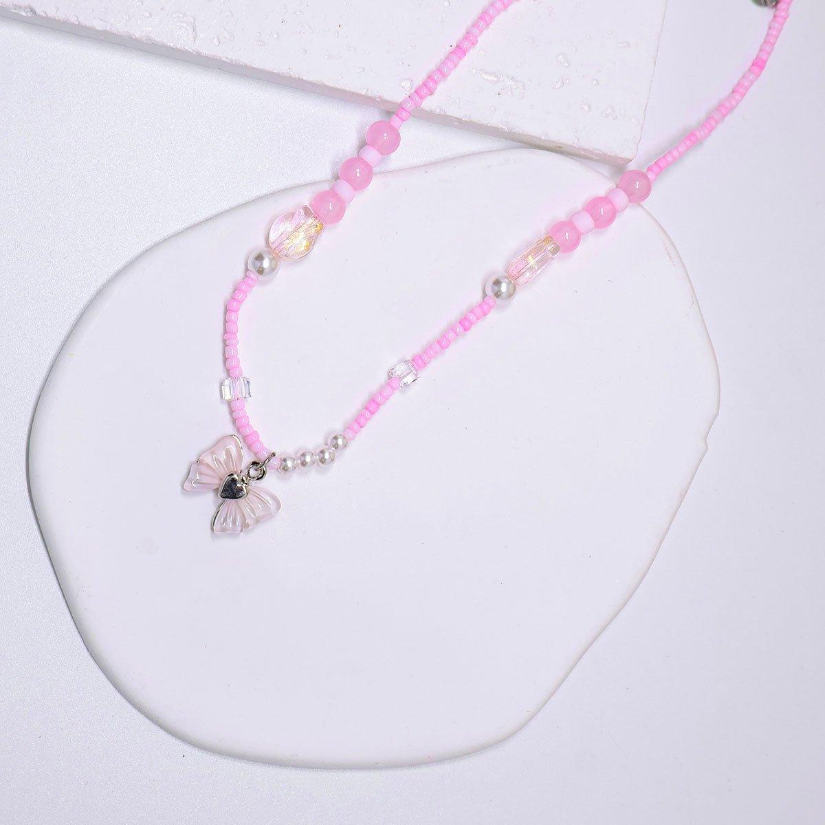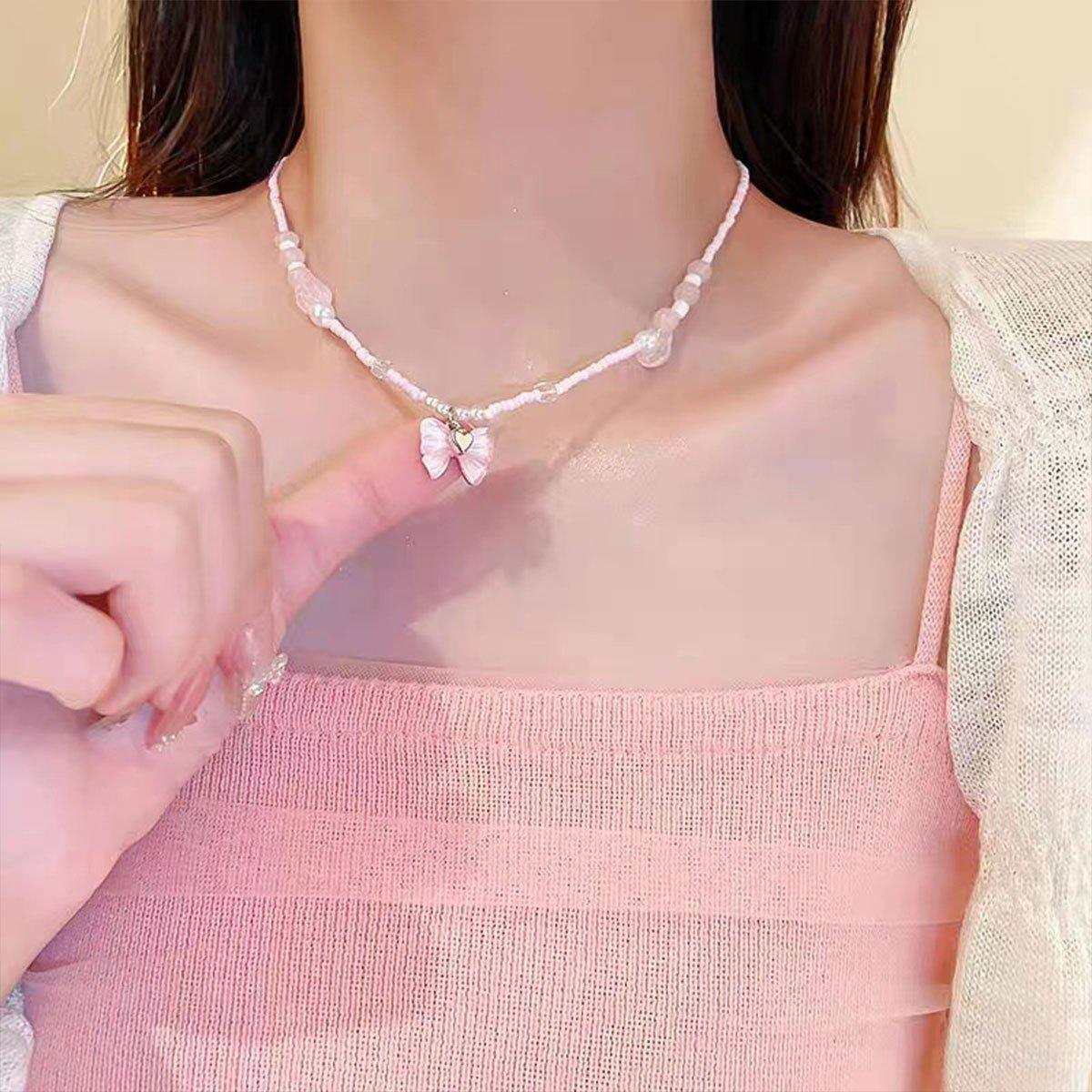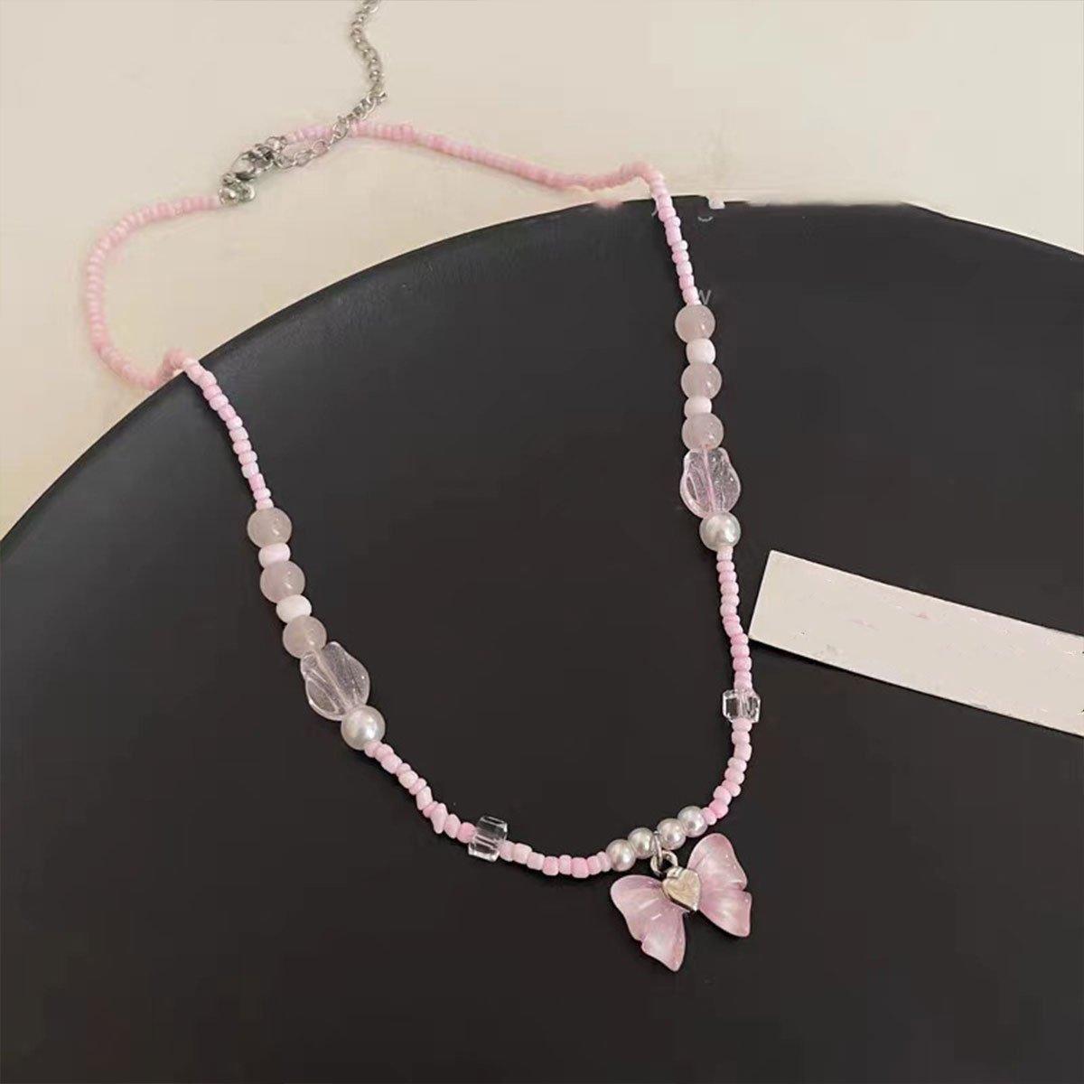 Handmade Pink Butterfly Beaded Necklace Women Girls Cute Boho Fashion