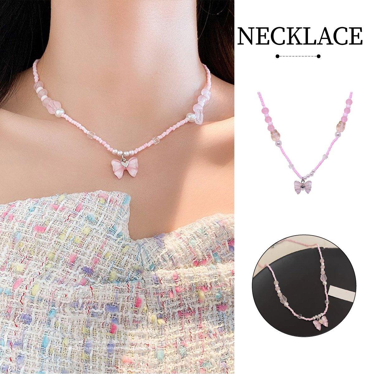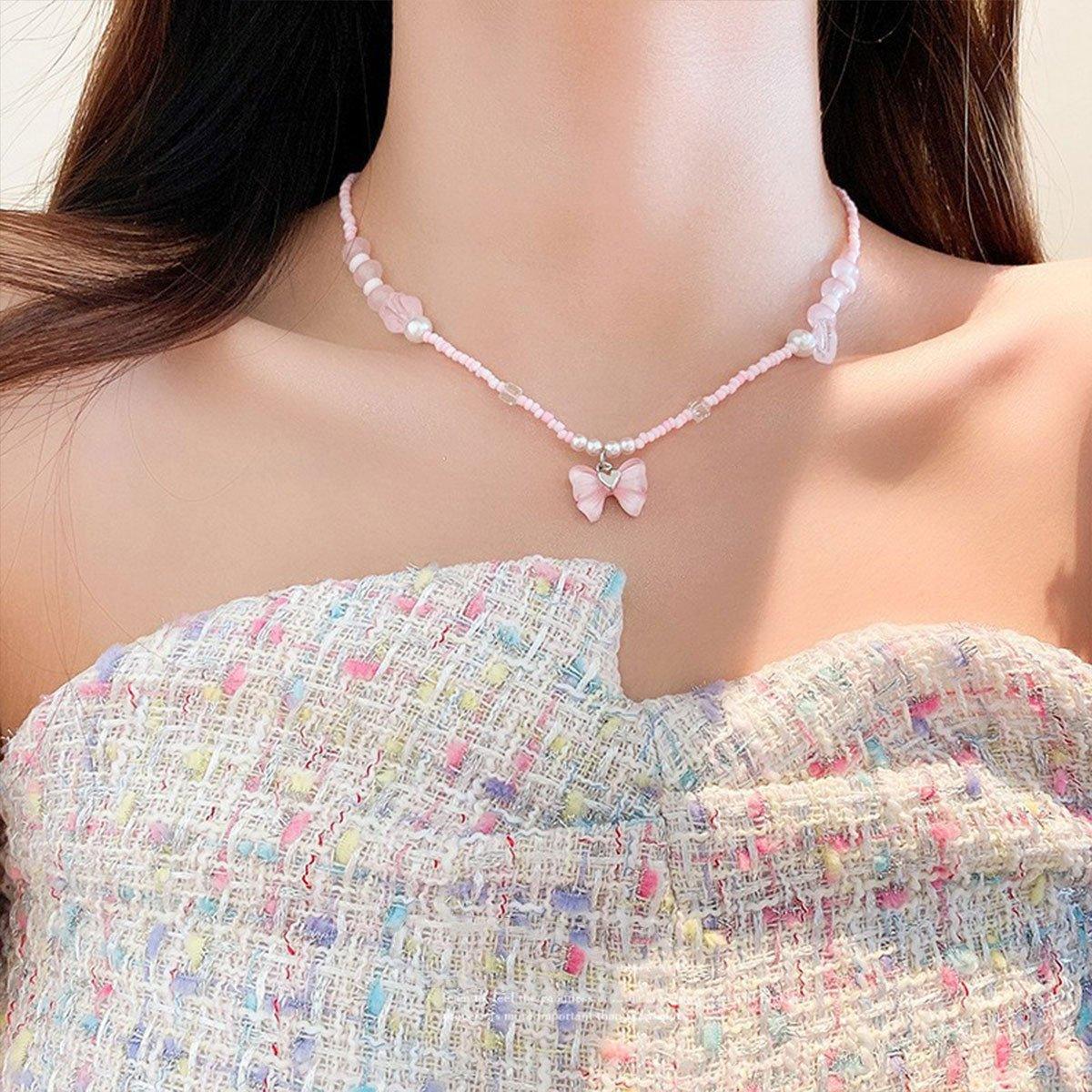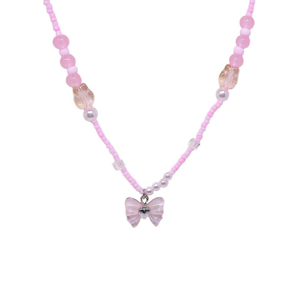 Handmade Pink Butterfly Beaded Necklace Women Girls Cute Boho Fashion