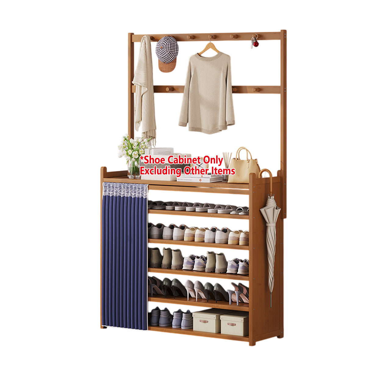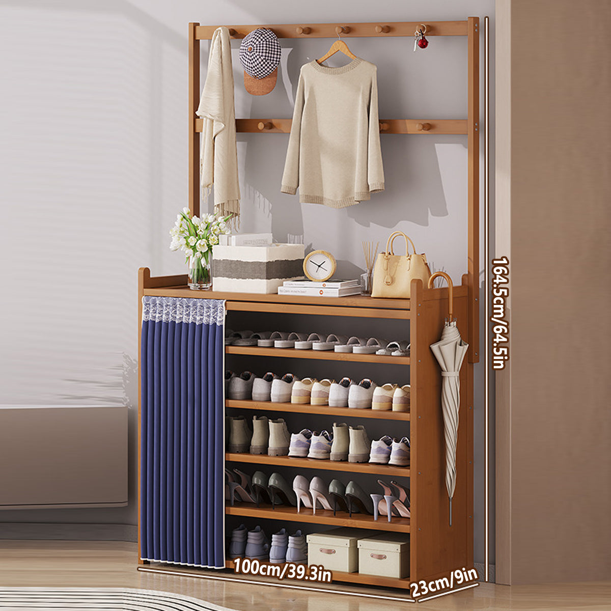 Multifunctional Bamboo Shoe Rack with Curtain for Entryway Shoes Hats Clothes
