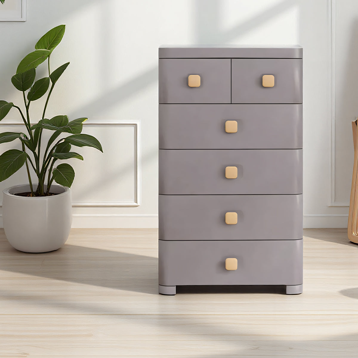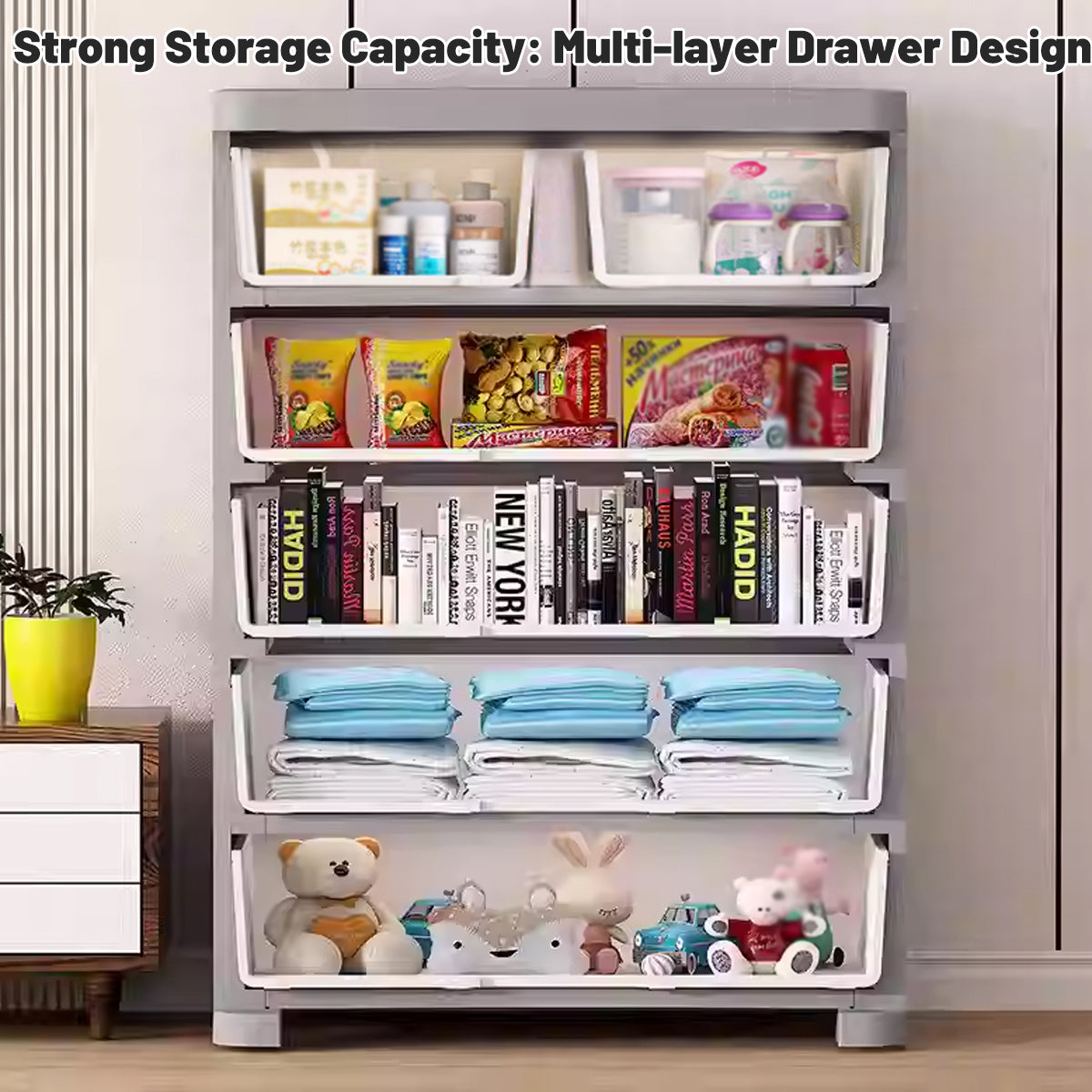 This multi layer plastic drawer cabinet provides practical storage for bedrooms and other living spaces. Made from durable PP material, it features five drawers for layered classification and convenient organization. Each drawer opens smoothly with the help of a slide track and mute pulley, and the enlarged handle makes daily use easier. The cabinet includes an anti drop stopper design that helps prevent drawers from falling out when pulled at an angle. The raised top tray offers stable placement for items such as headphones, books and small decorations. Its vertical structure helps save floor space while keeping frequently used items organized and accessible.