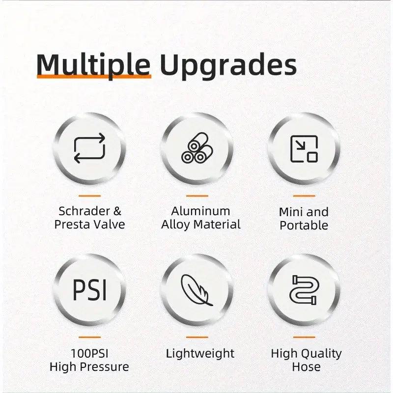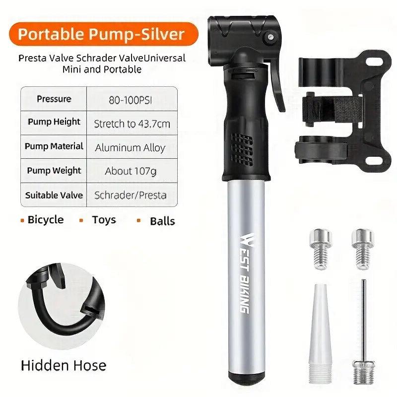 This mini portable bike pump is the perfect companion for cyclists and outdoor enthusiasts. Designed with a durable aluminium alloy body, it can withstand rigorous use while offering great performance. The compact and lightweight pump features a hidden flexible hose that extends when needed and retracts to save space when not in use. It supports both Presta and Schrader valves, making it compatible with various bicycles, sports balls, and inflatable toys. With a high-pressure capacity of up to 100PSI, this pump ensures efficient and quick inflation wherever you go.