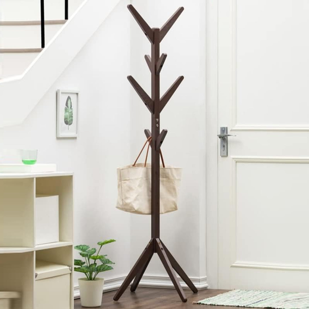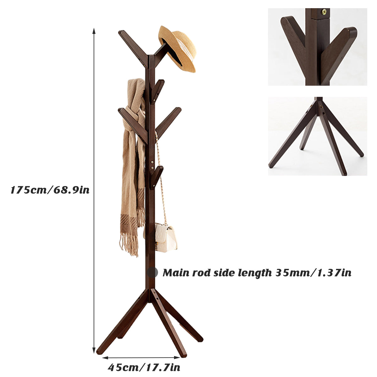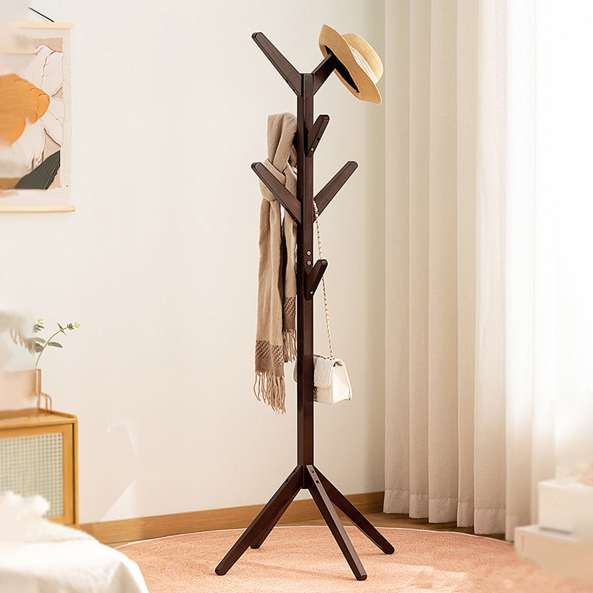 Solid Wood Coat Rack Floor Standing Clothes Hanger with 8 Hooks