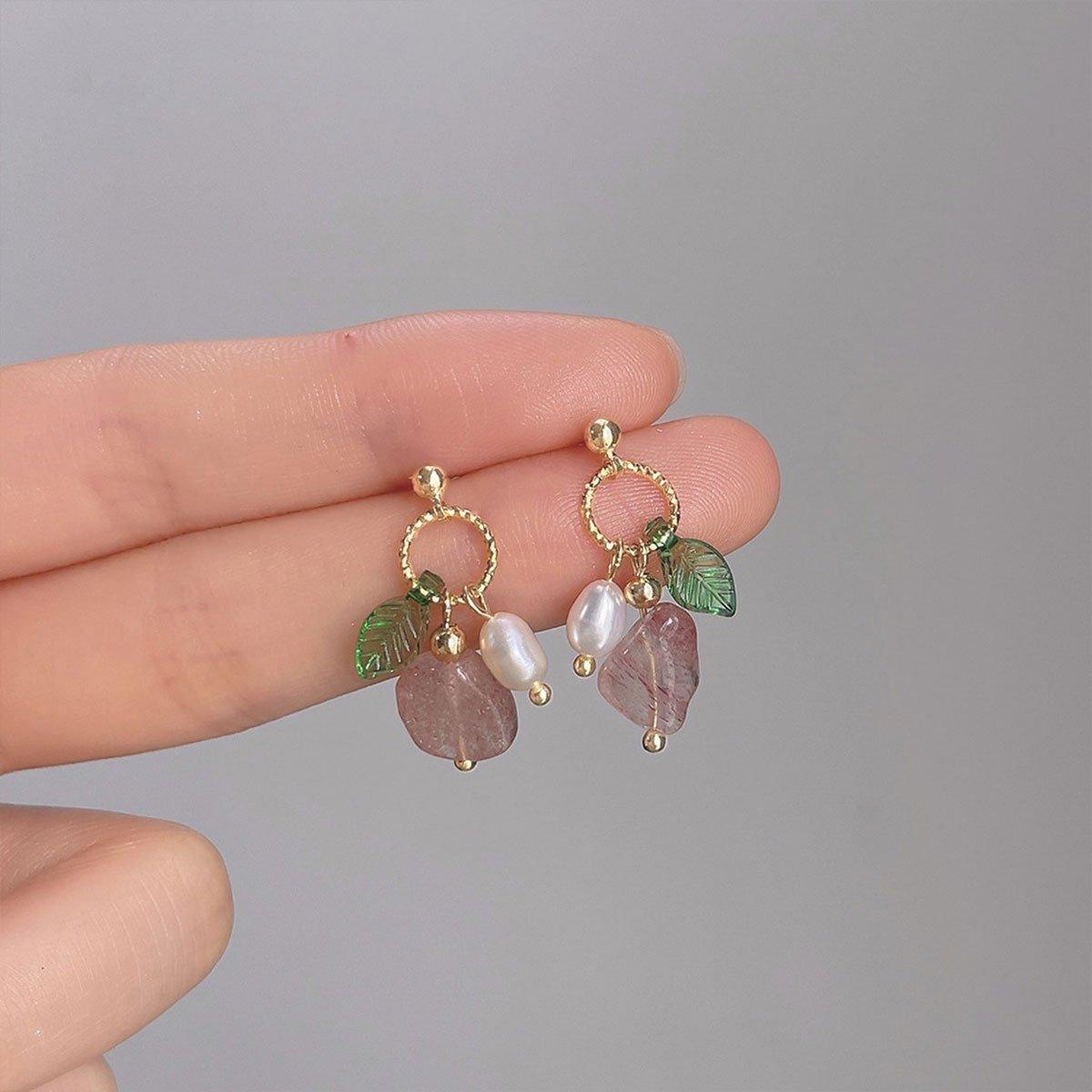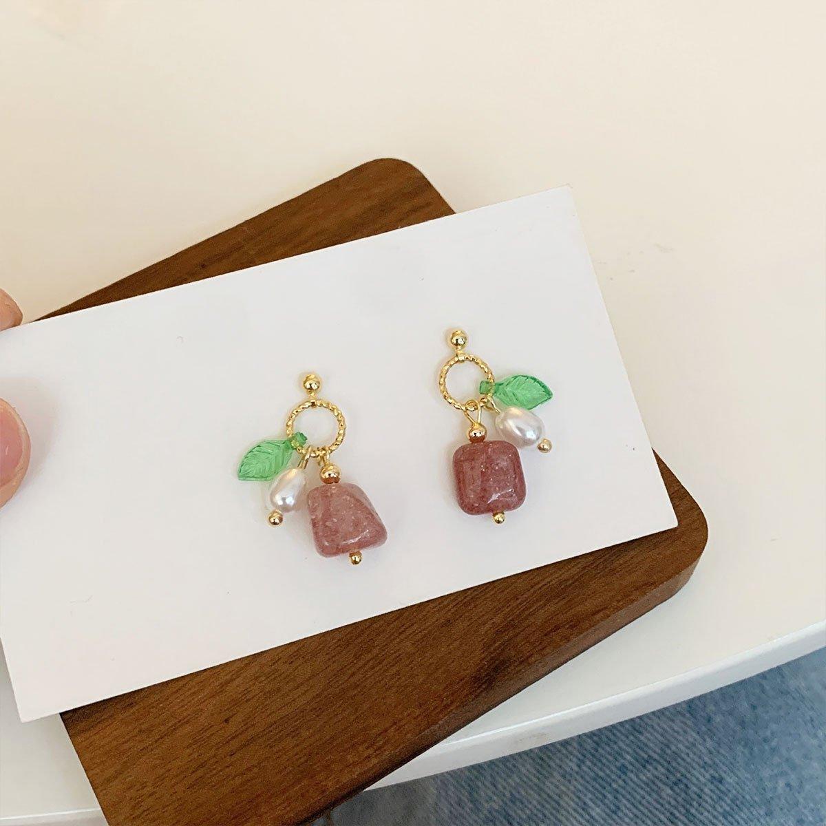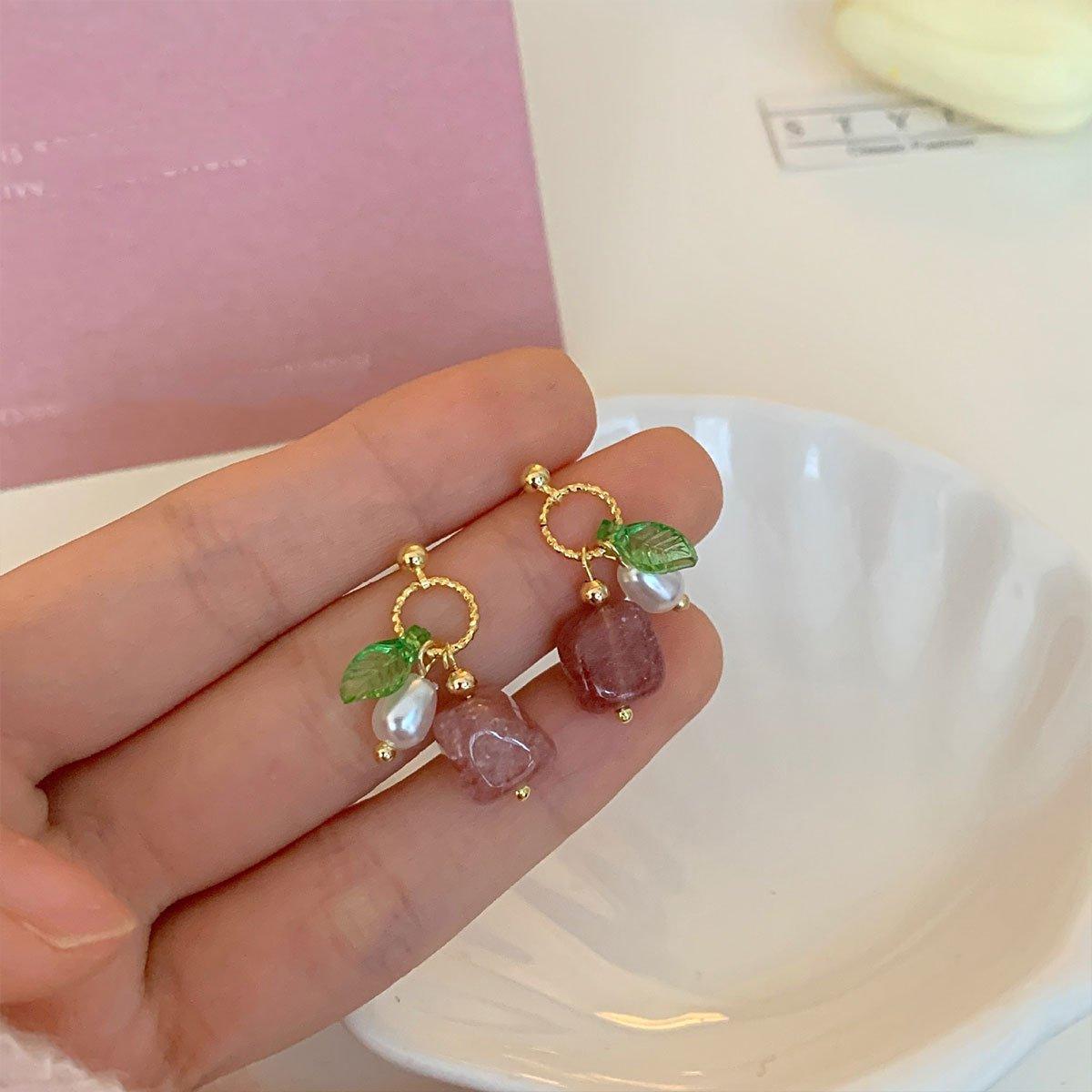 Unique Geometric Strawberry Crystal Green Leaf Earrings with Imitation Pearls