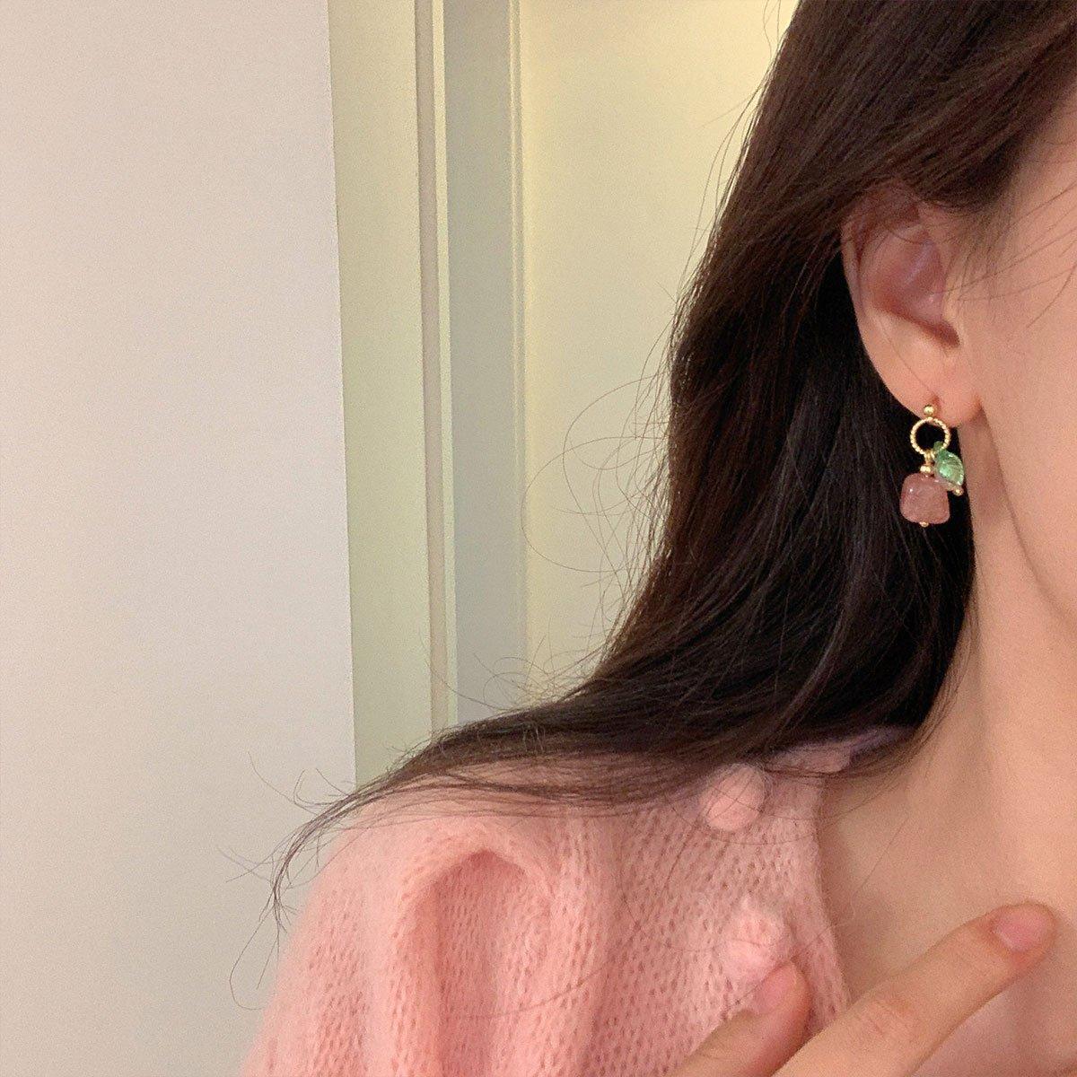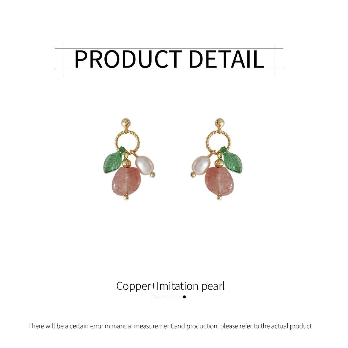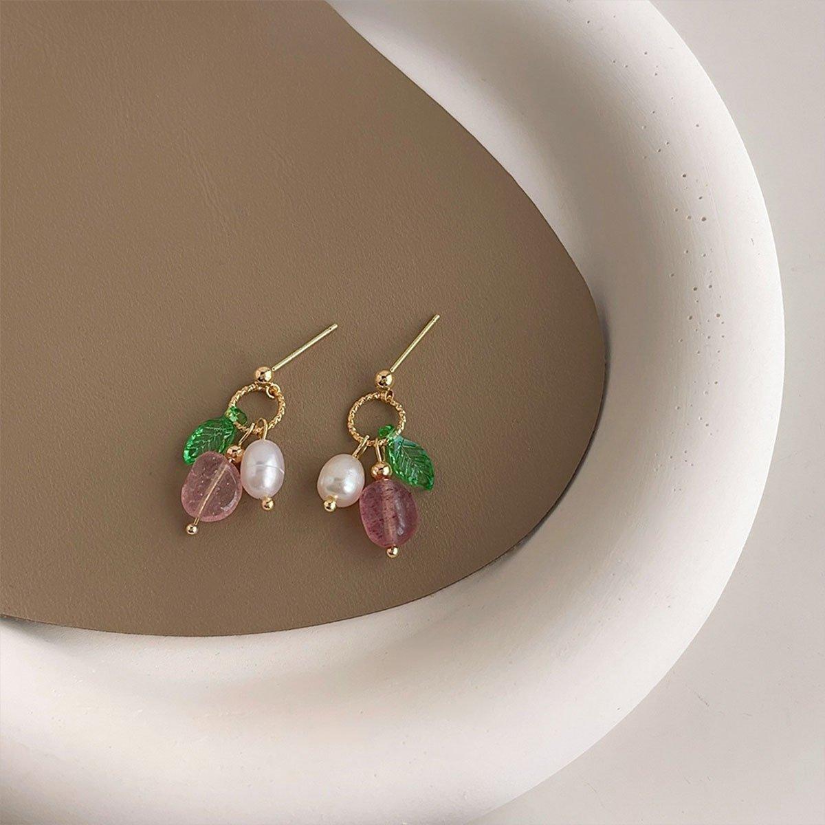 Unique Geometric Strawberry Crystal Green Leaf Earrings with Imitation Pearls