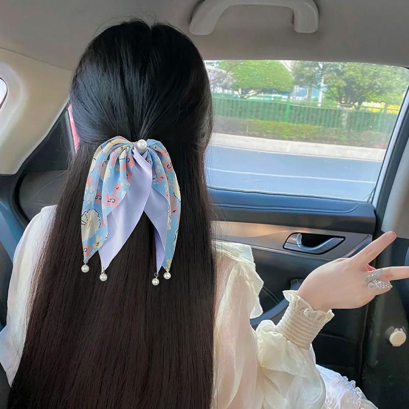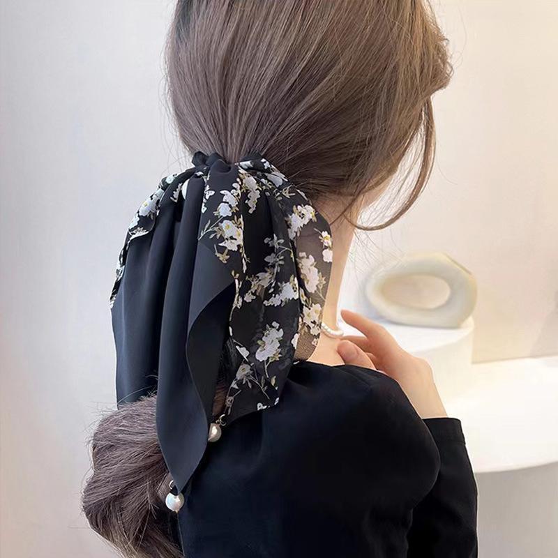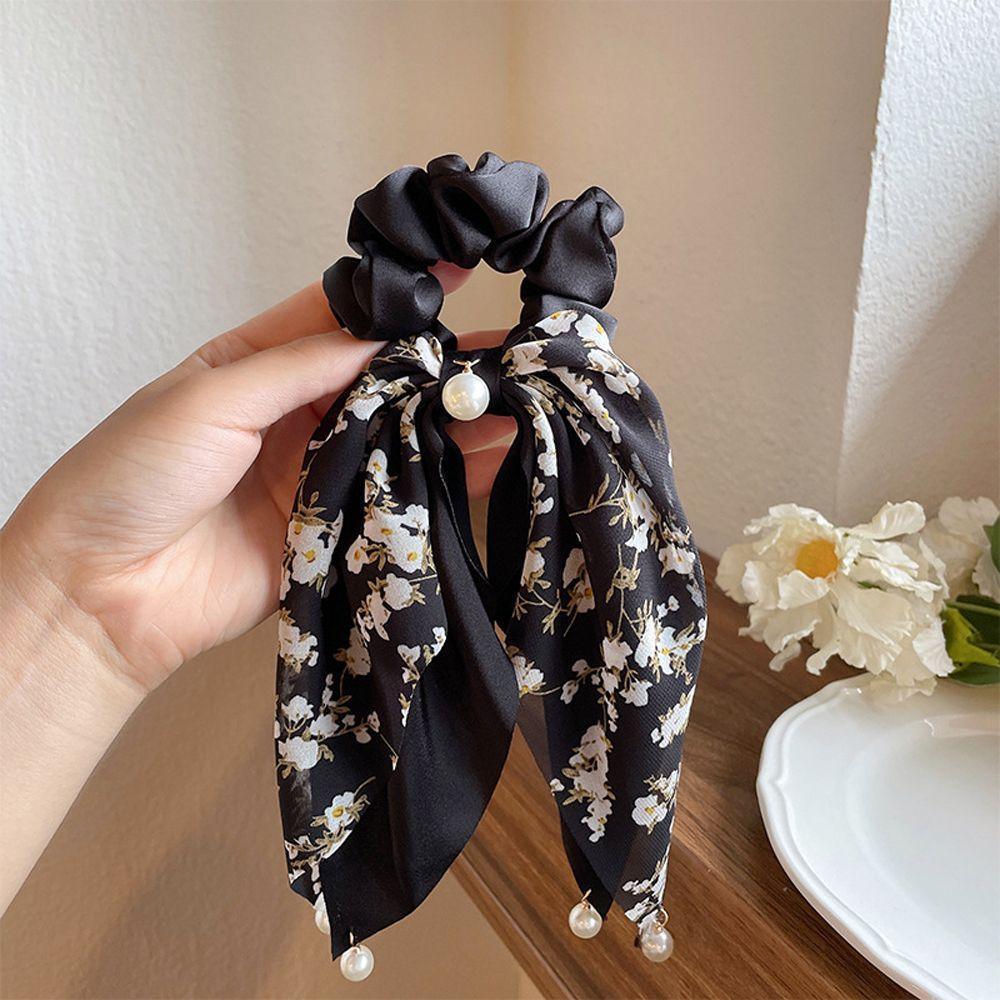 Vintage Boho Silk Bowknot Flower Hair Scrunchies Women Hair Bands Rope Pearl