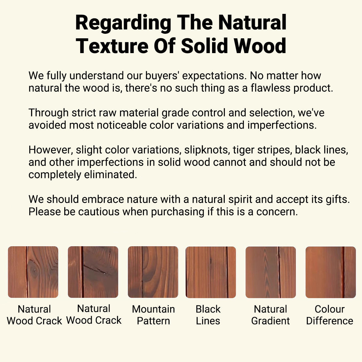 Natural solid wood features such as knots, grain variation, small cracks or colour differences are normal, as shown in the reference images.