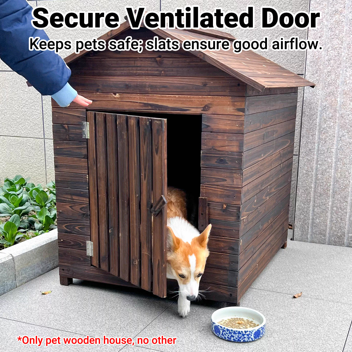 The wooden dog house includes a slanted roof designed to reduce water buildup, making it suitable for general outdoor weather exposure as indicated in the images.