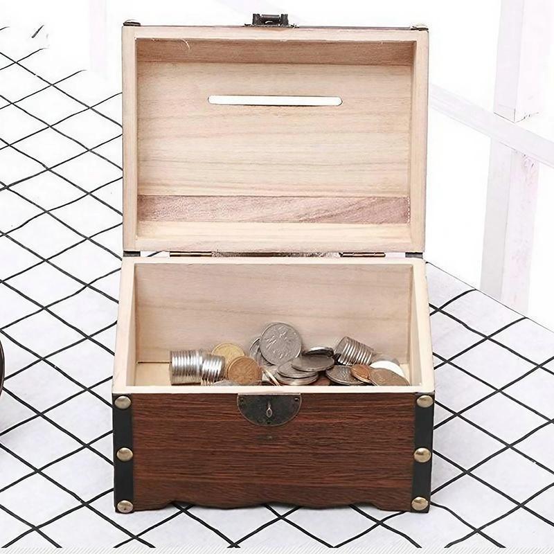 Wooden Treasure Chest Retro Money Storage Box Case Coin Piggy Bank Organizer